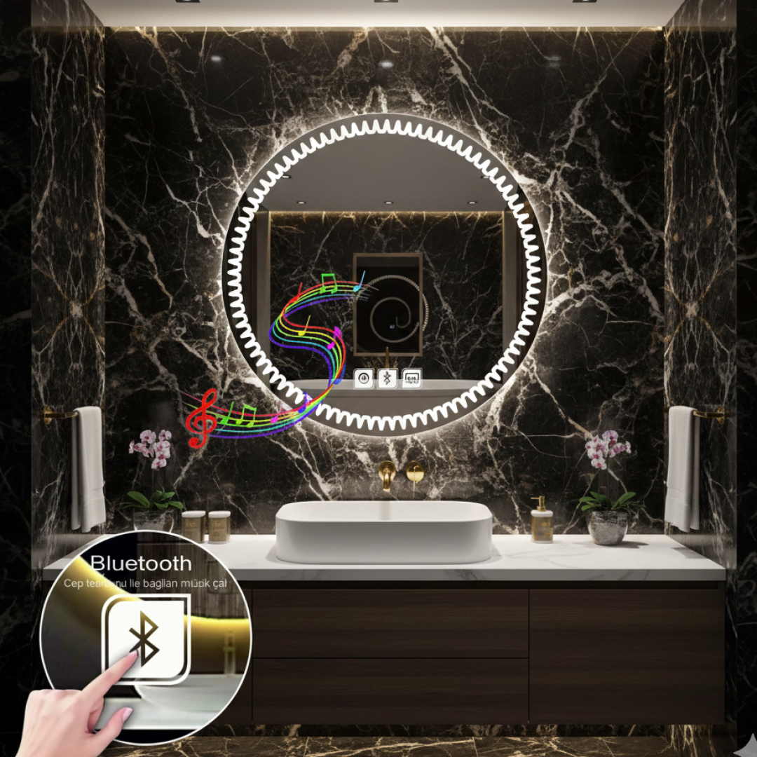 Bu modelimiz yalnızca bir ayna değil; LED aydınlatma, müzik sistemi ve büyüteç özelliklerini bir araya getiren çok amaçlı bir dekorasyon ve teknoloji ürünüdür.