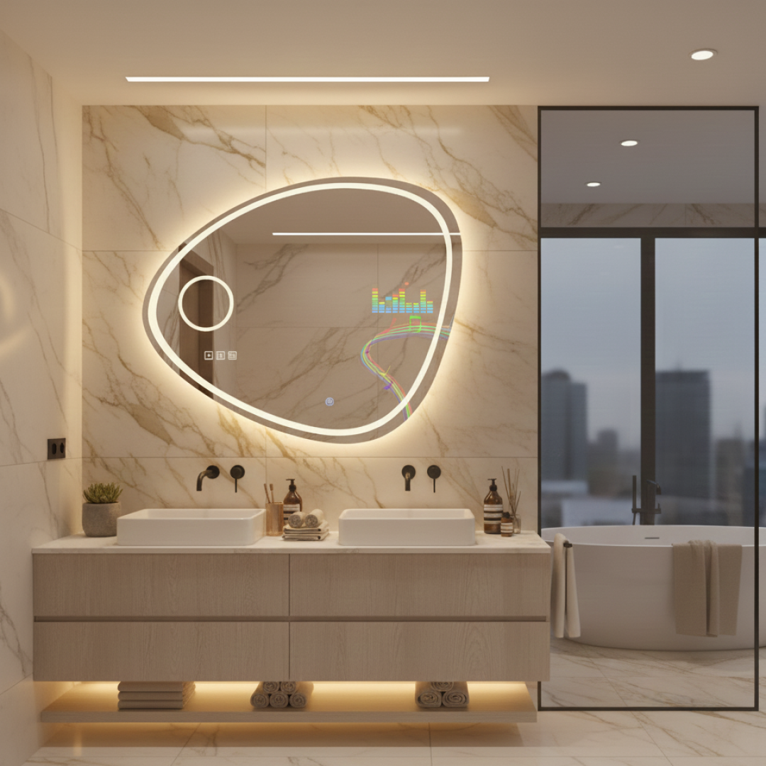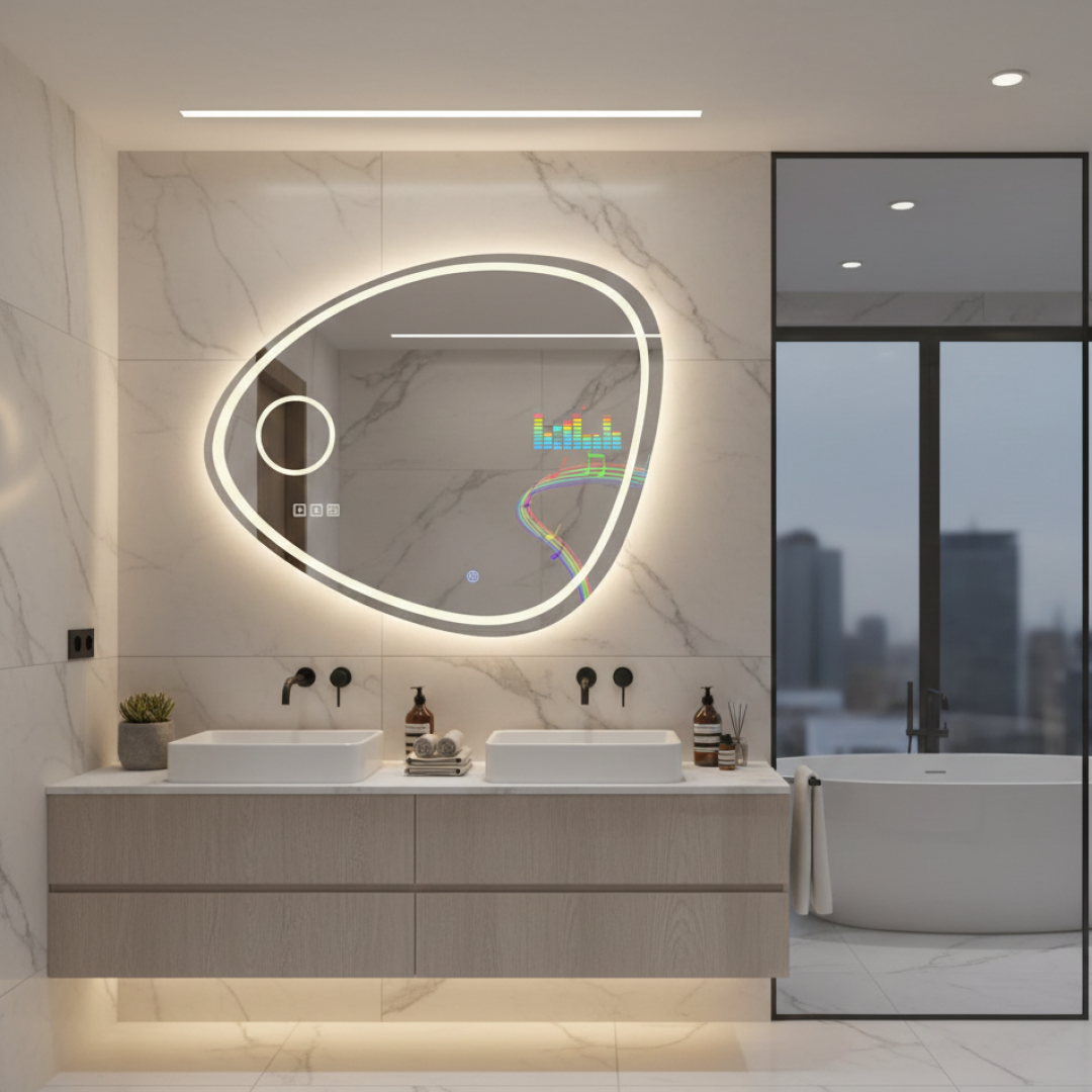 Bu modelimiz yalnızca bir ayna değil; LED aydınlatma, müzik sistemi ve büyüteç özelliklerini bir araya getiren çok amaçlı bir dekorasyon ve teknoloji ürünüdür.